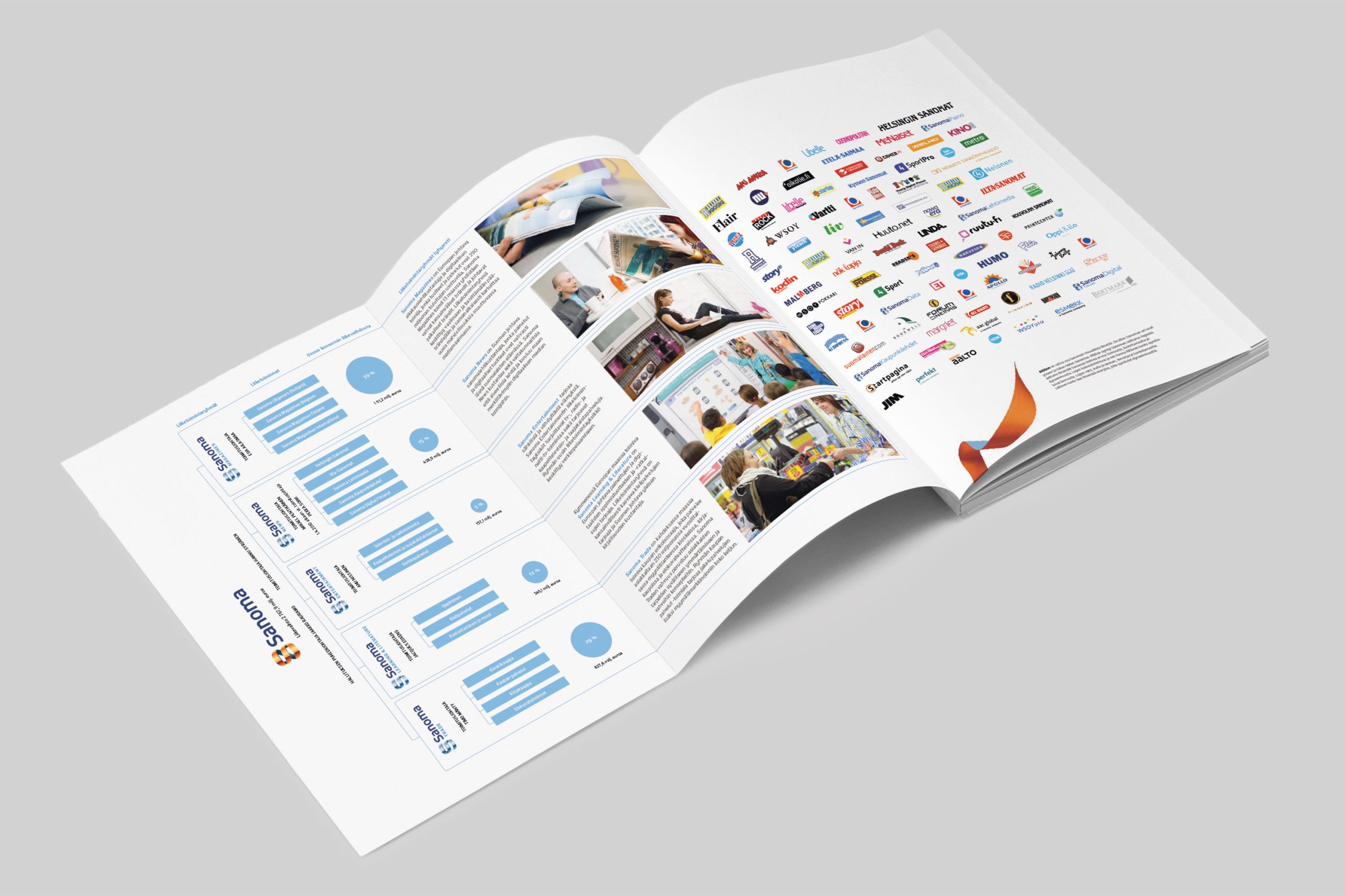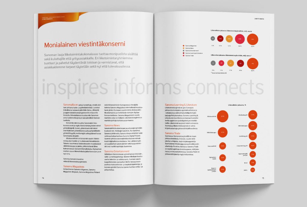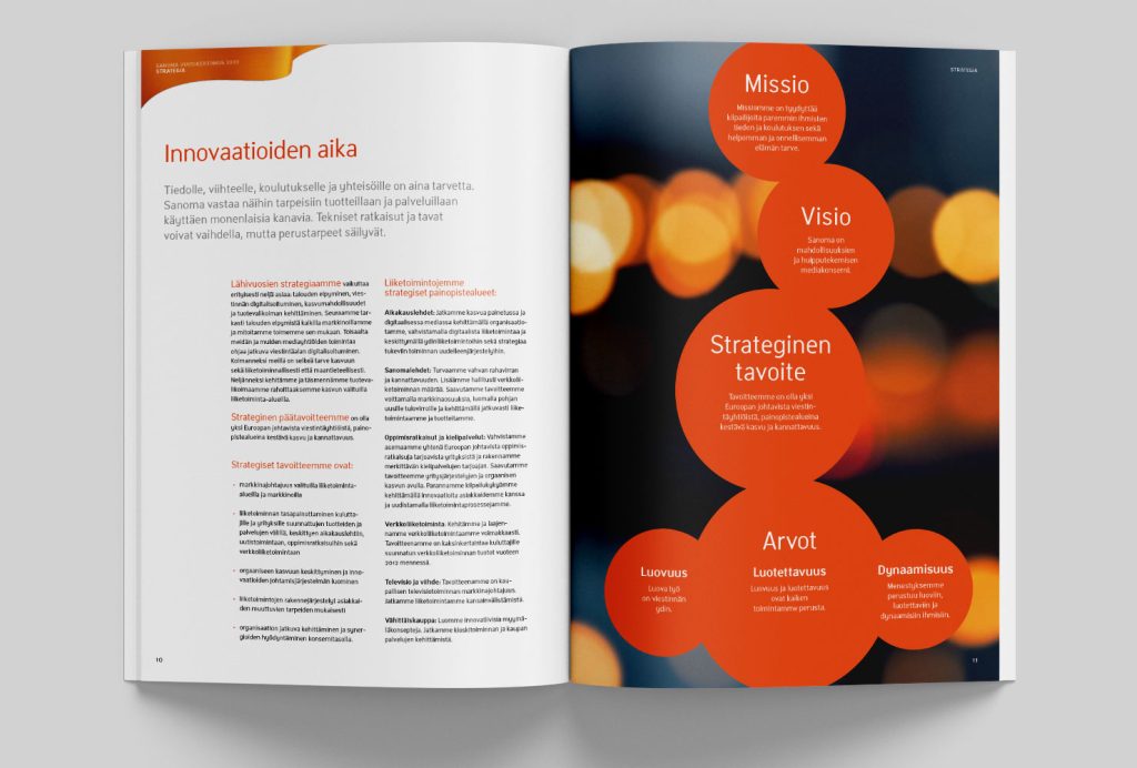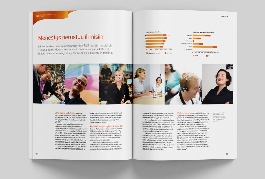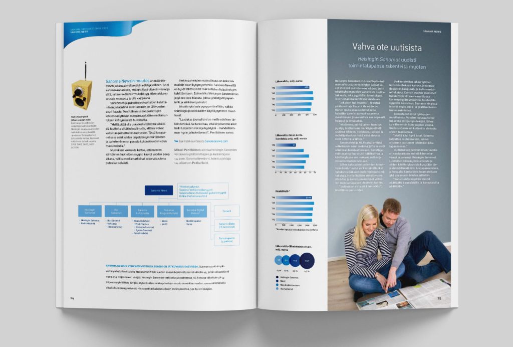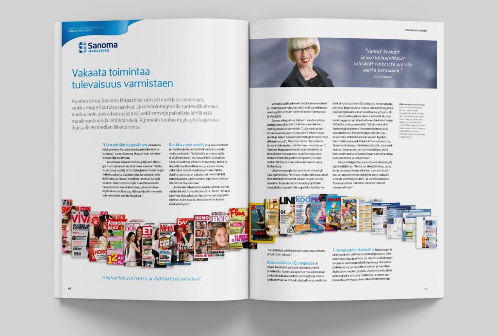 Sanoman vuoden 2009 vuosikertomuksen visuaalisen ilmeen suunnittelu perustui konsernin brandiohjeiston ribbon-elementin käyttöön ’jatkuvan mediavirran’ symbolina.
